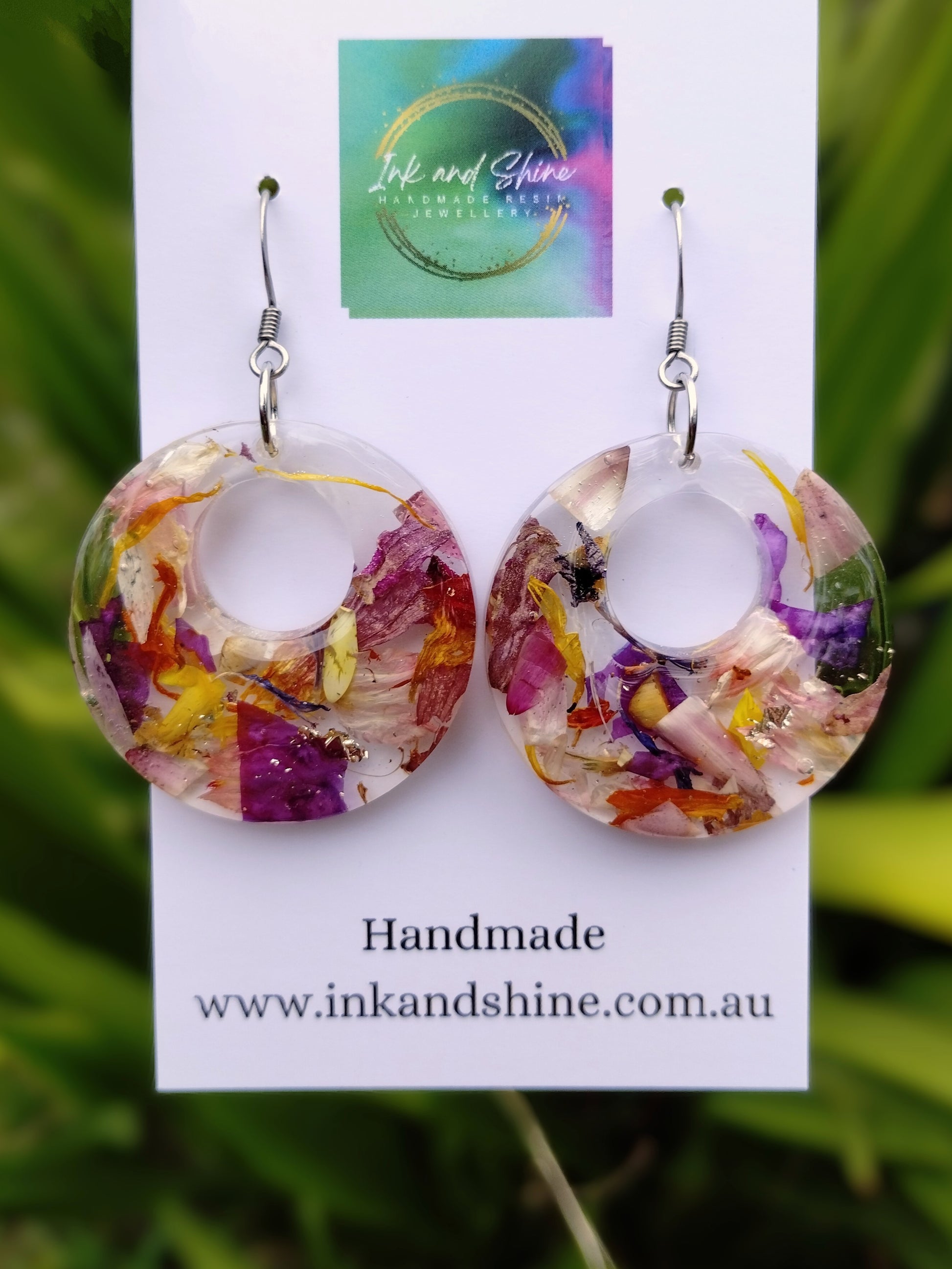 These statement earrings are made with clear resin and organic dried flowers, capturing the beauty of nature in a wearable form. Each pair is handmade with care and attention to detail, and no two are exactly alike. The flowers are carefully selected for their vibrant colors and delicate beauty, and the clear resin allows them to be displayed in all their glory. The foil accents add a touch of sparkle, making these earrings perfect for any occasion.