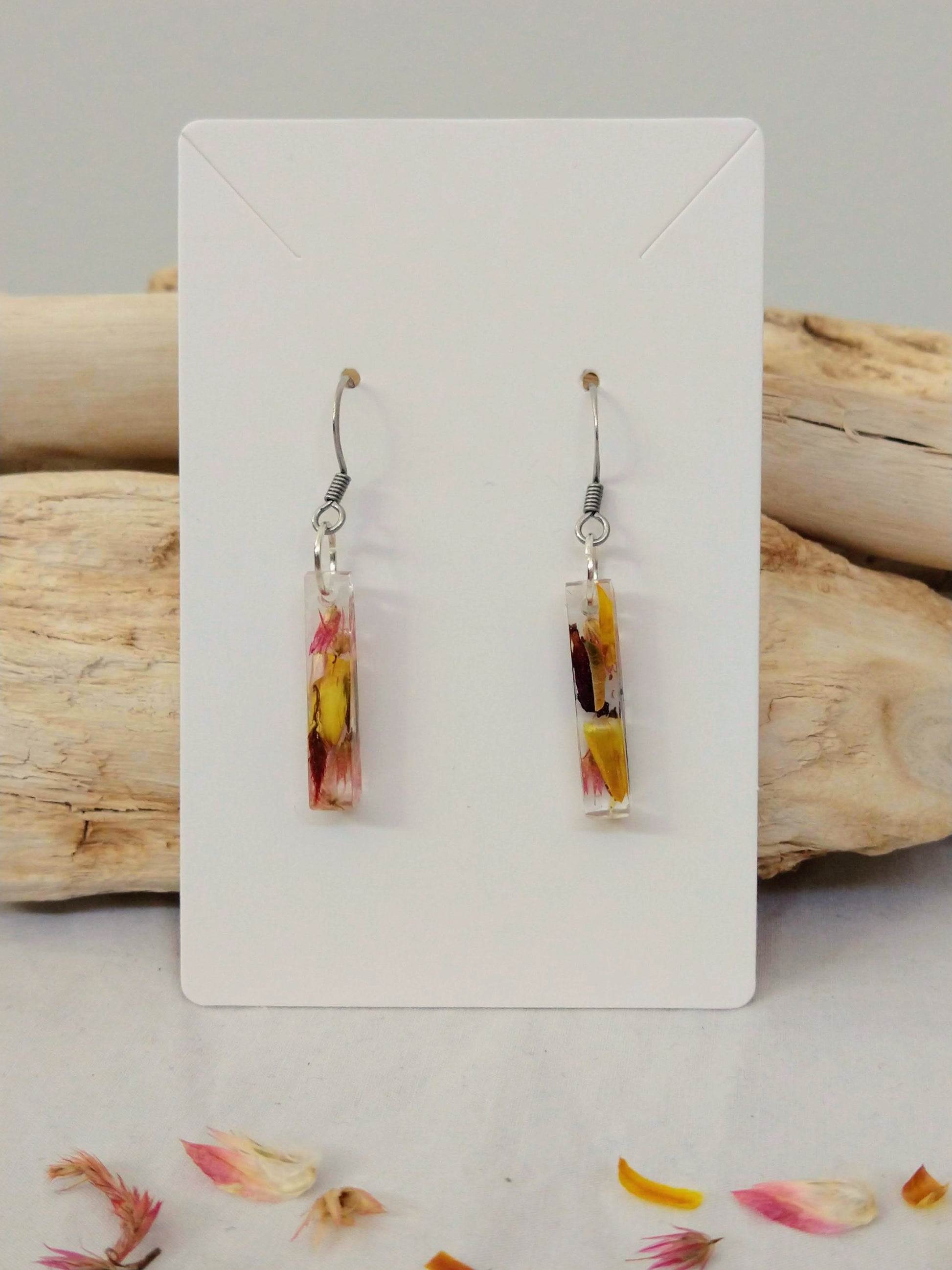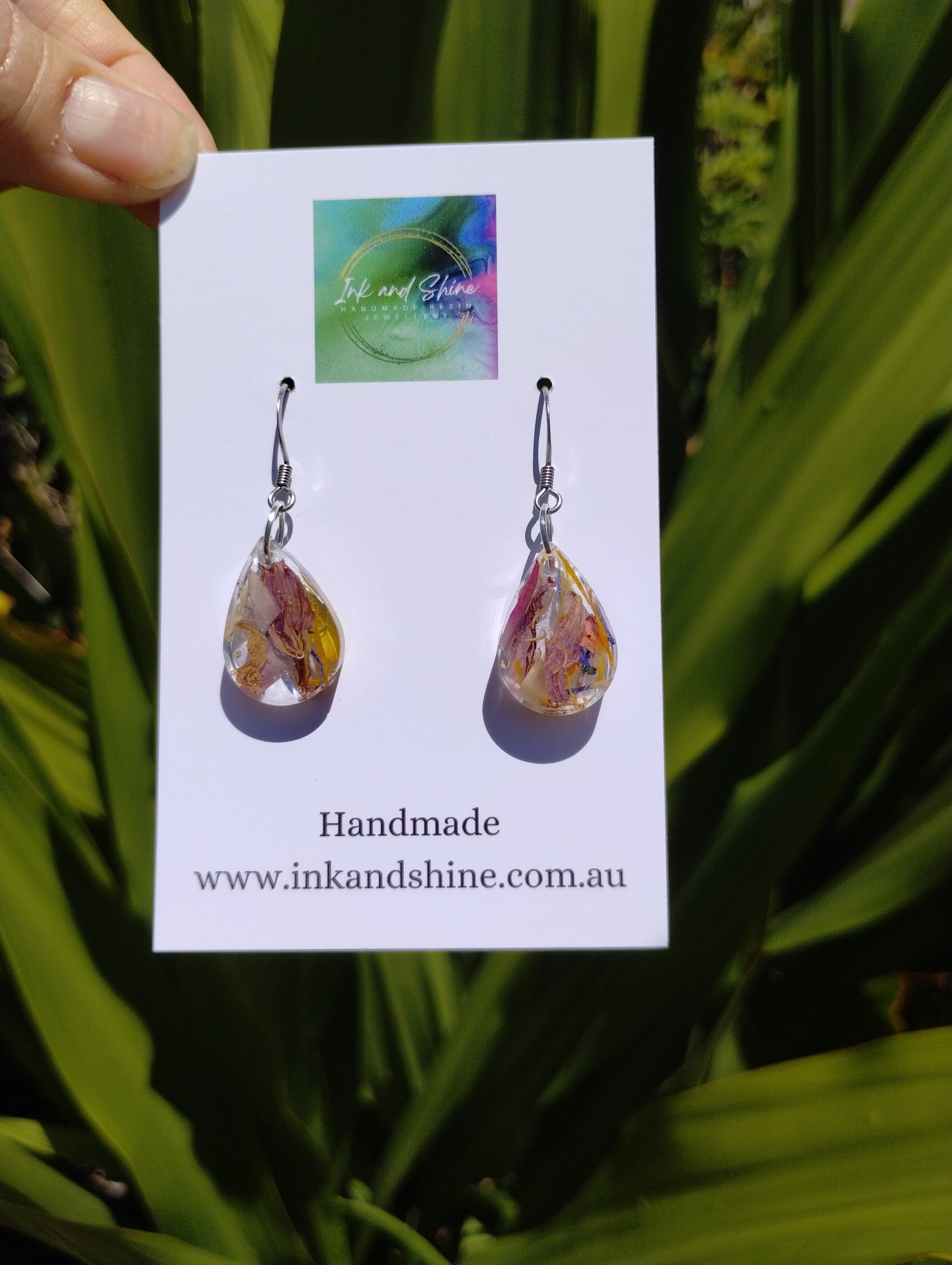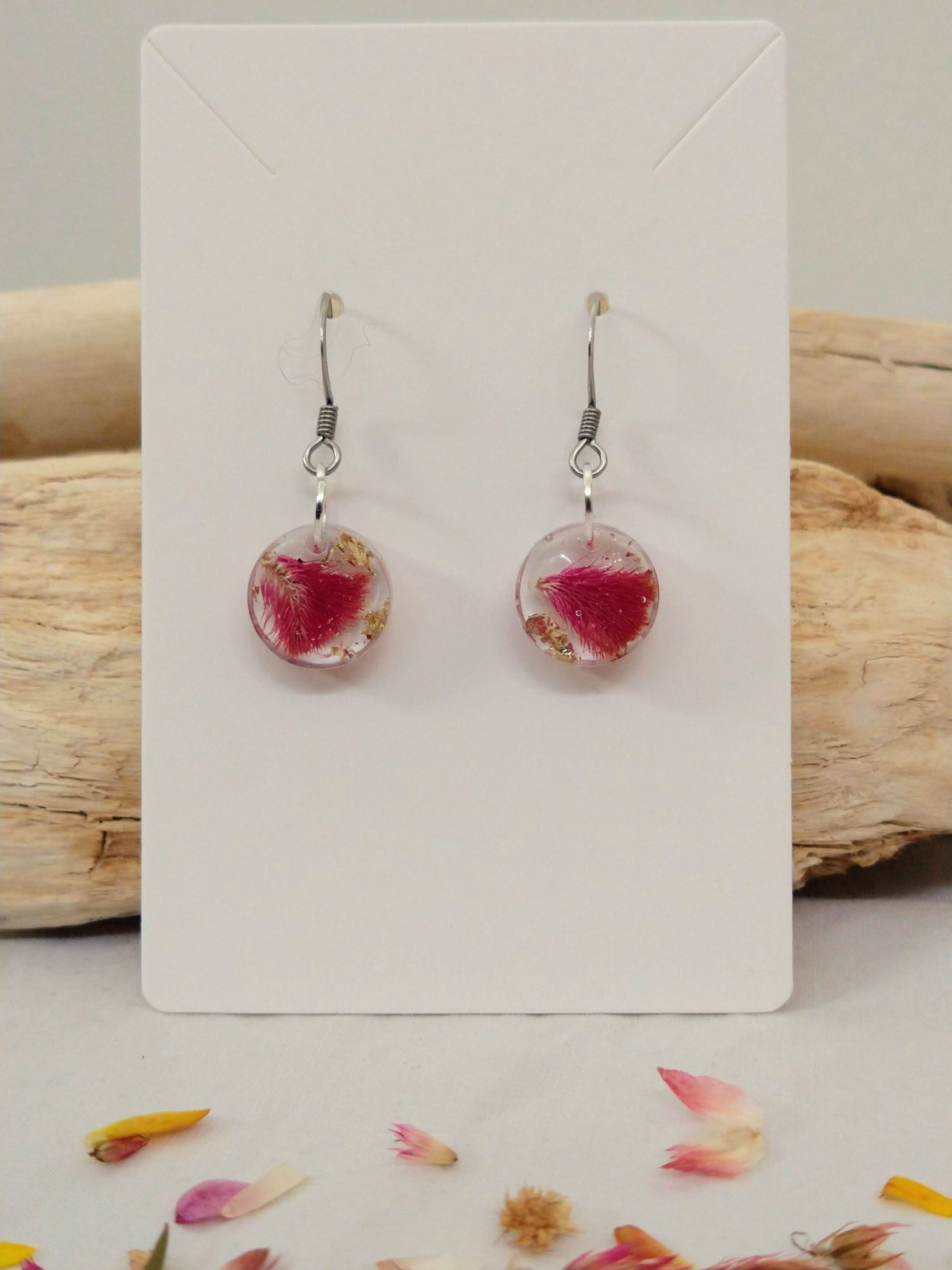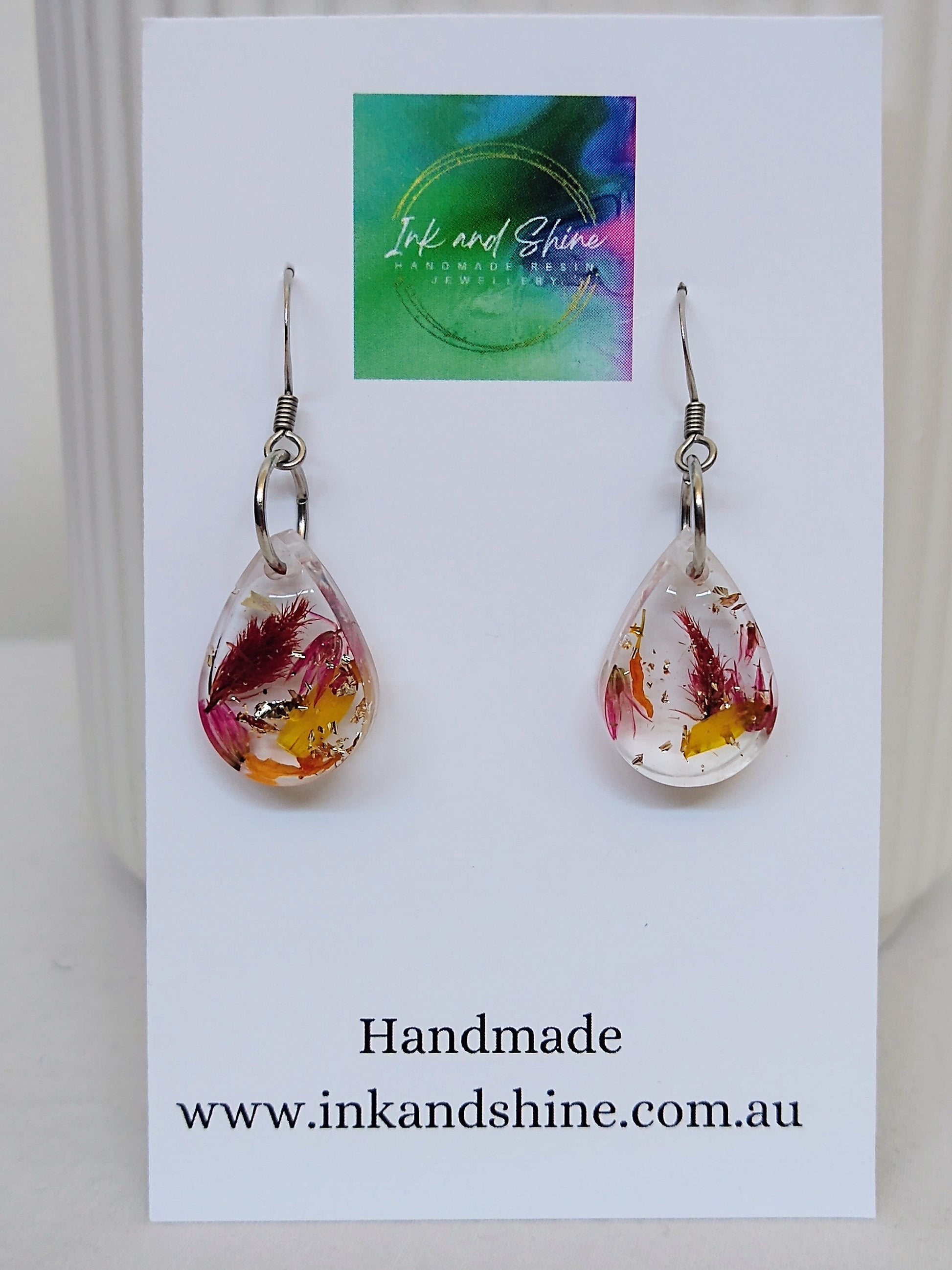 These dainty earrings are made with clear resin and organic dried flowers, capturing the beauty of nature in a wearable form. Each pair of earrings is handmade with care and attention to detail, and no two are exactly alike. The flowers are carefully selected for their vibrant colours and delicate beauty, and the clear resin allows them to be displayed in all their glory. The addition of a touch of sparkle adds a touch of elegance to these unique and stylish earrings.