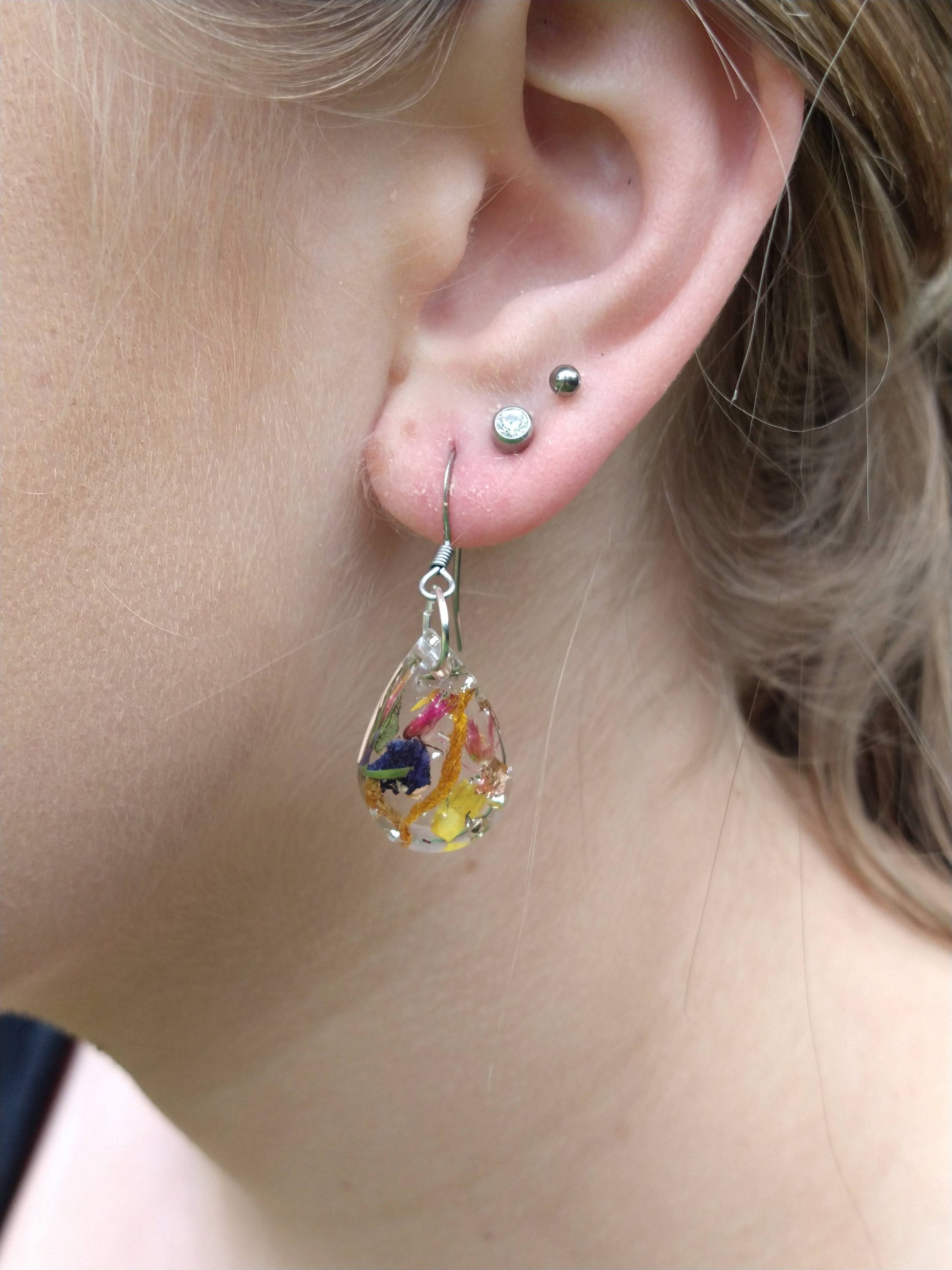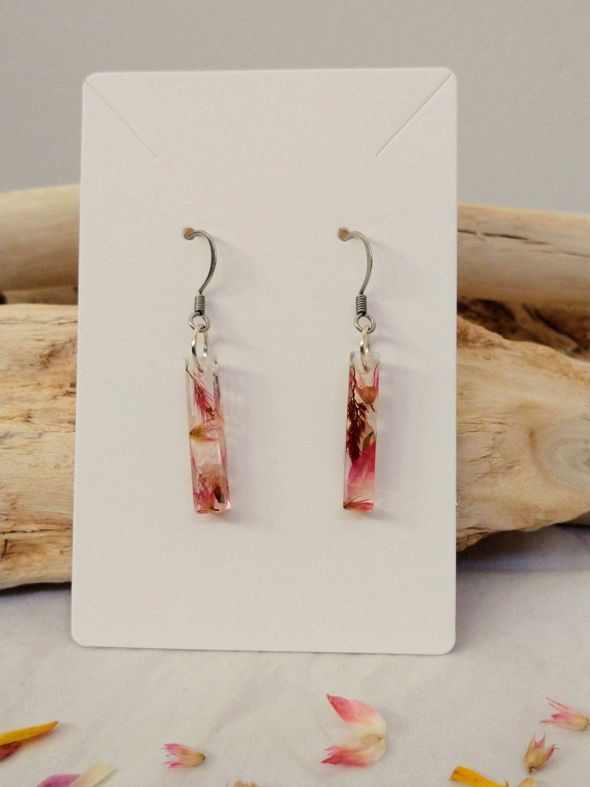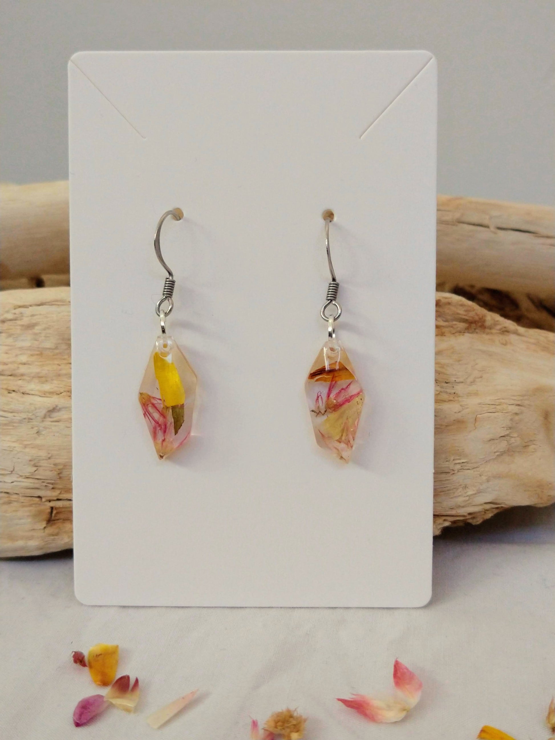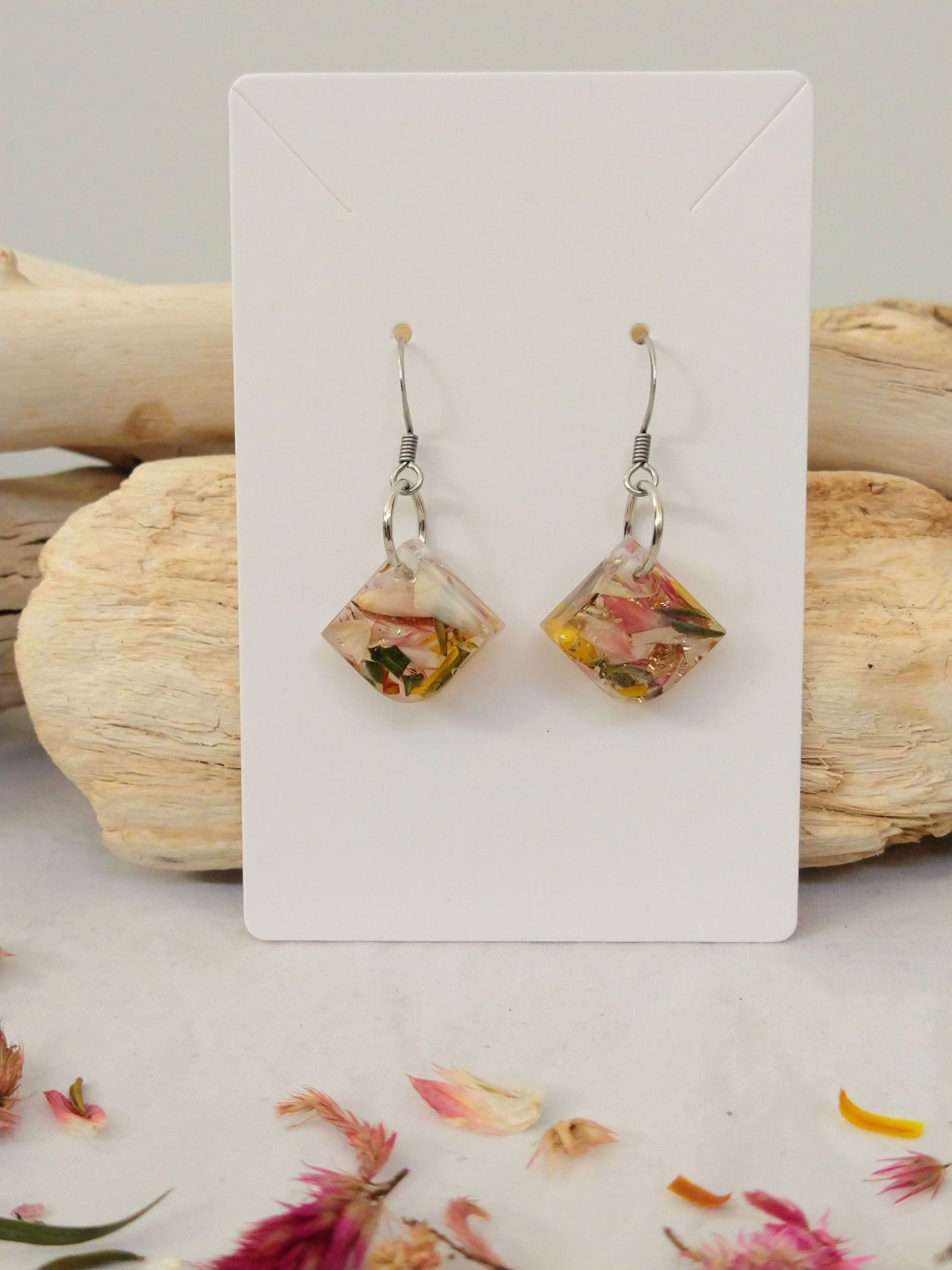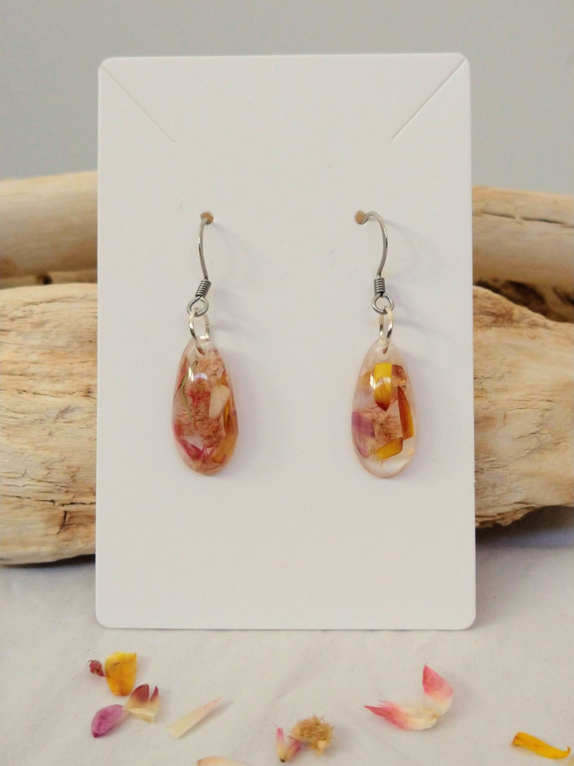 These dainty earrings are made with clear resin and organic dried flowers, capturing the beauty of nature in a wearable form. Each pair of earrings is handmade with care and attention to detail, and no two are exactly alike. The flowers are carefully selected for their vibrant colours and delicate beauty, and the clear resin allows them to be displayed in all their glory. The addition of a touch of sparkle adds a touch of elegance to these unique and stylish earrings.