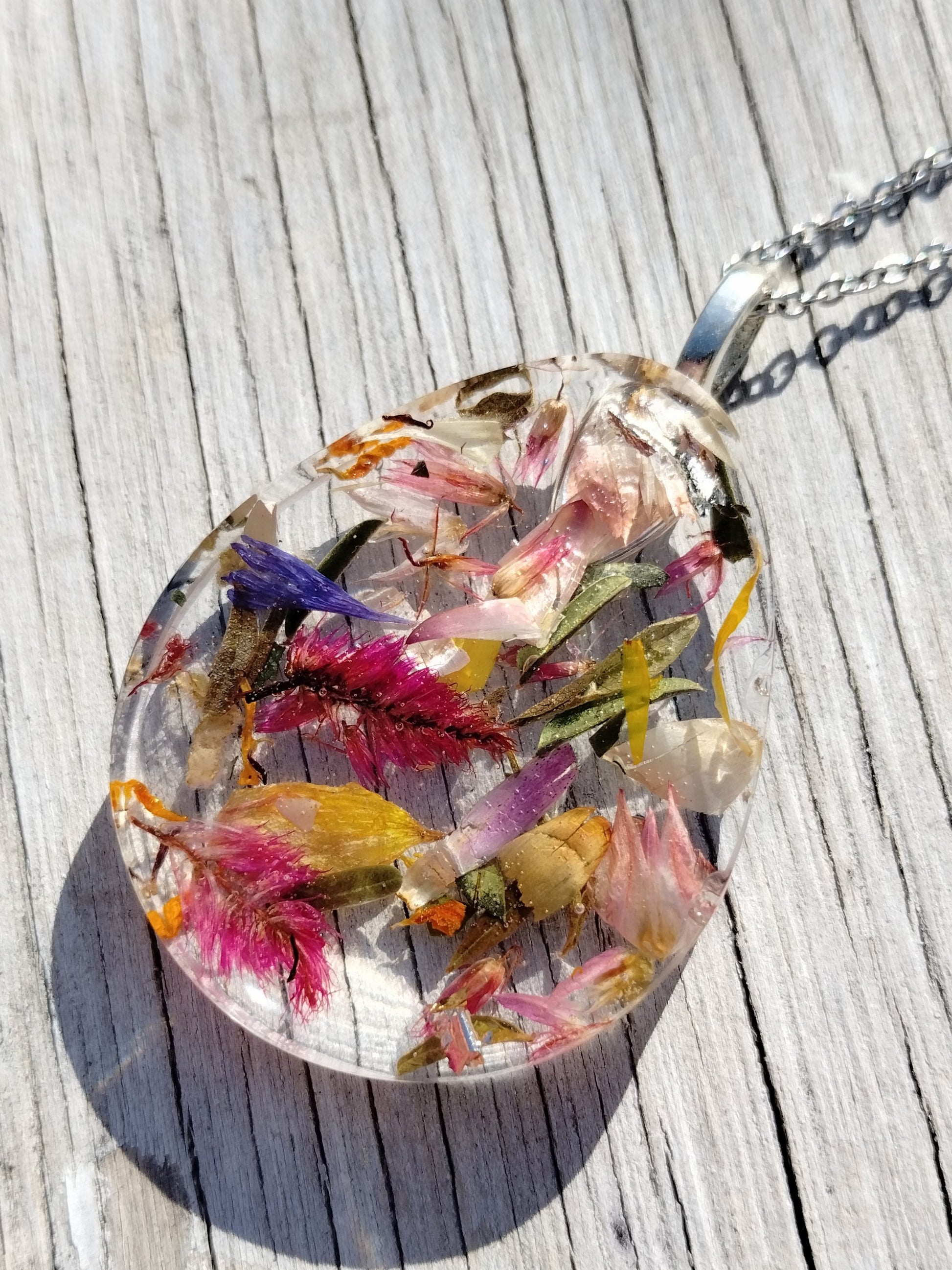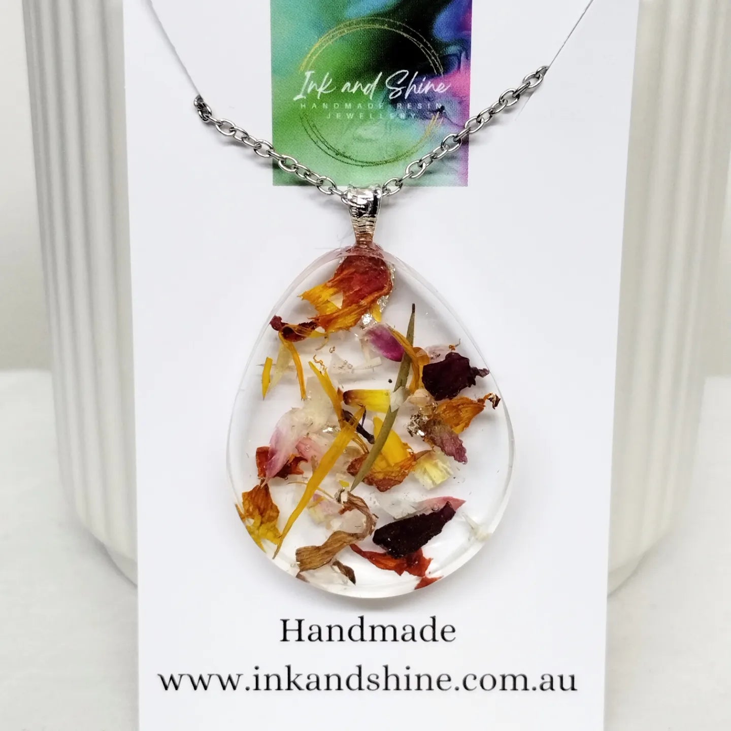 Our best-selling Botanical Egg Pendant Necklace is a beautiful and unique piece of jewellery that is sure to turn heads. This necklace features a clear resin egg shaped pendant with organic dried flowers and a touch of gold foil for added sparkle. The flowers are carefully selected for their vibrant colors and delicate beauty, and the clear resin allows them to be displayed in all their glory. The gold foil adds a touch of elegance, making this necklace the perfect choice for any special occasion.