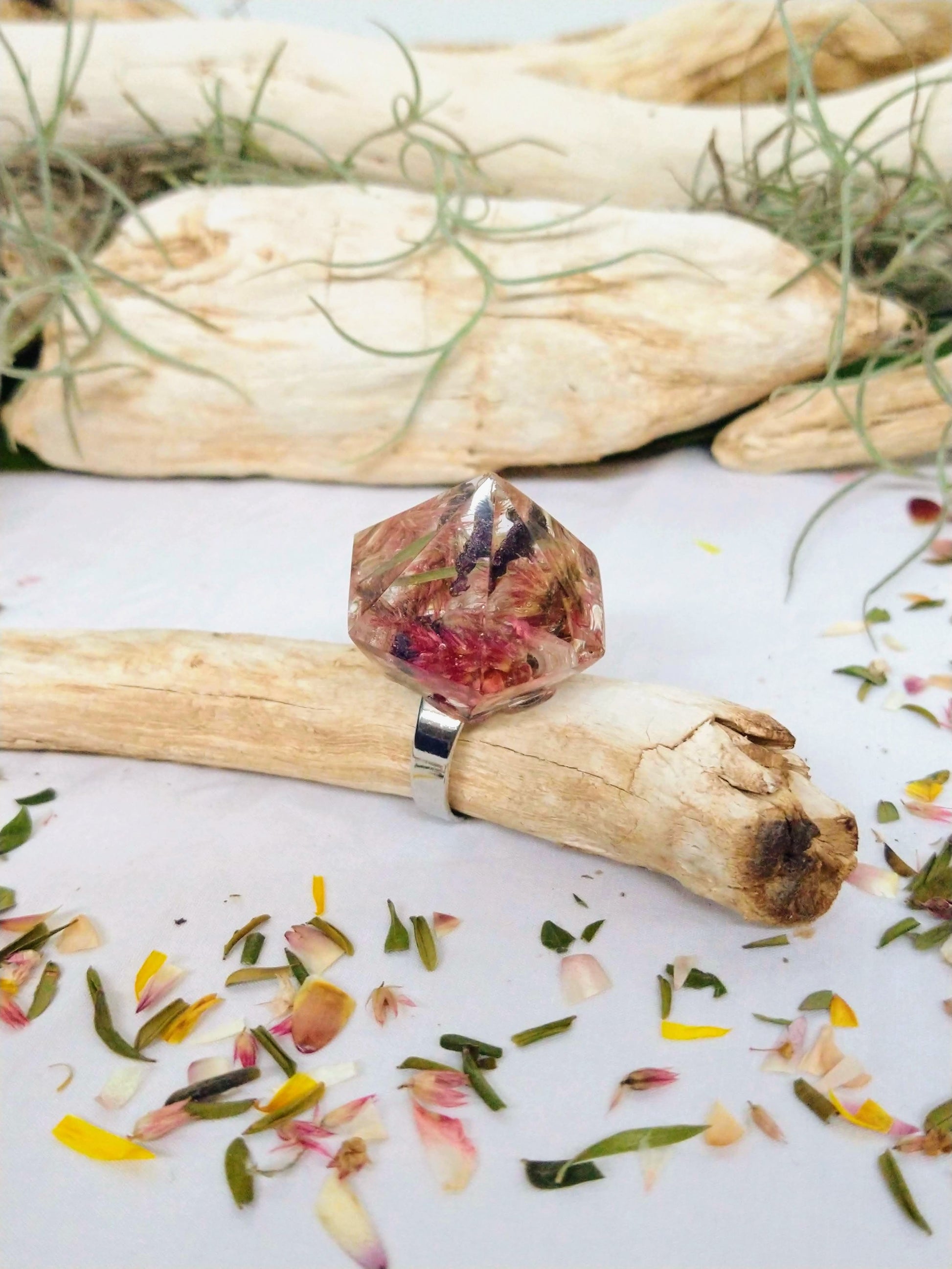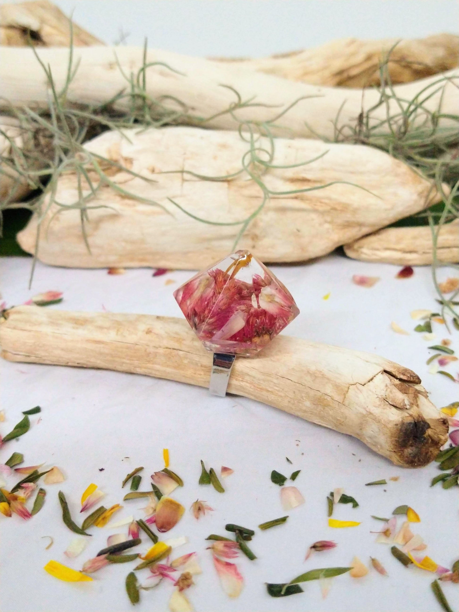 Experience the beauty of nature with these stunning Botanical Statement Rings! Filled with organic dried flowers, each ring is handcrafted from hand-poured resin with exceptional attention to detail and creativity. Adjustable to fit perfectly on your finger, no two pieces are alike, making each ring a one-of-a-kind treasure.